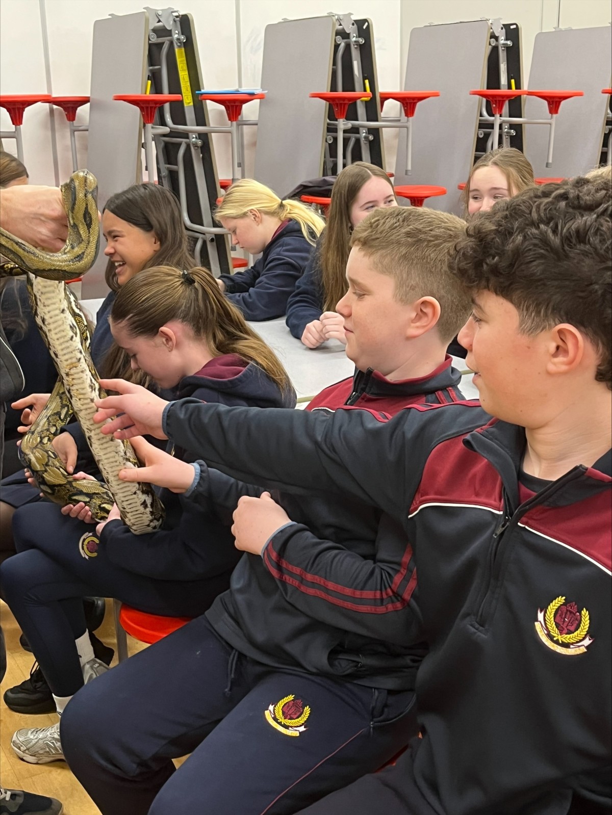 Midlands Reptile Zoo came to visit the 1st Years for Science Week today. We met pythons, tarantulas and a baby camen crocodile!  We learnt about their habitats and how they contribute to biodiversity and even got to hold the python.