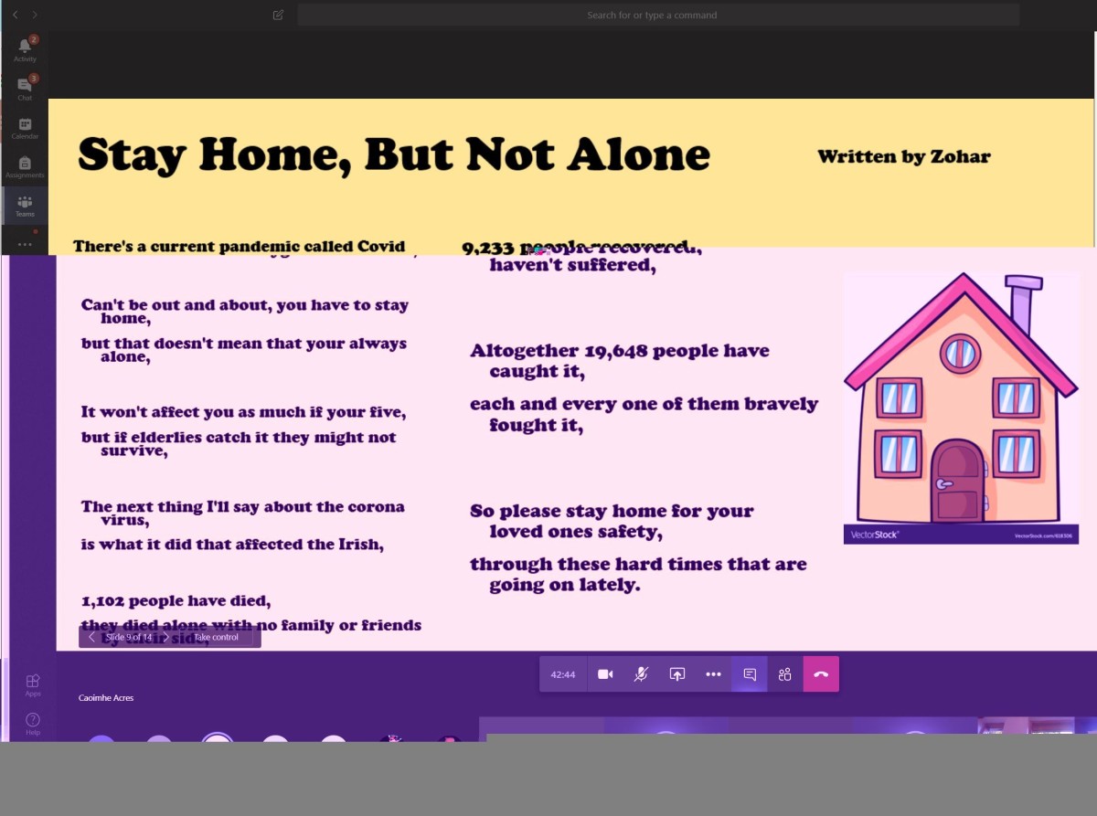 All week they've been working hard rehearsing musical pieces to play, writing poetry, creating their presentation and speeches, plus very importantly rehearsing how to host a meeting online with so many 1st years presenting in the assembly. The theme of their assembly was: "We Are All in This Together -'Thank you Frontline Workers' – Friday,1st May International Workers' Day.