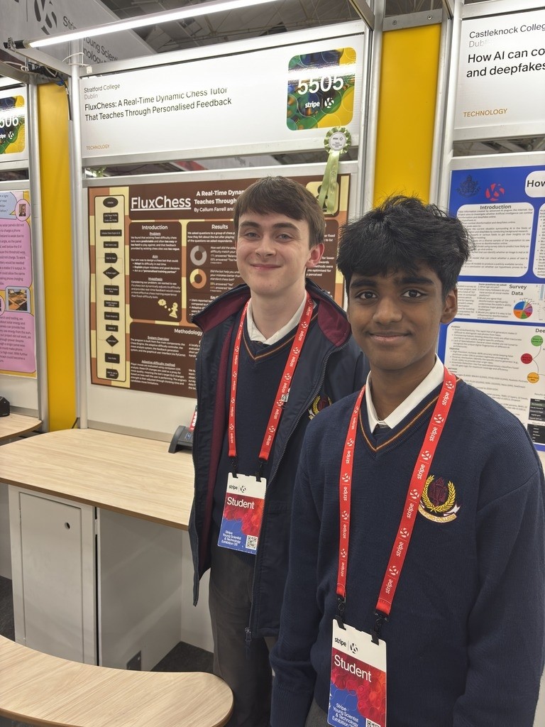 The whole of Stratford College and community are so, so proud of 5th Year students, Hao Wen and Ritvik, for winning one of the top four awards in this year's competition - the Runner Up Group Award. They also won the Institute of Physics Special Award. A big thank you to Dr Ryan for mentoring the 5th year students. Major congratulations to TY students Callum and Sanket for getting a Highly Commended award for their FluxChess project in a very challenging category, mentored by Ms O'Kelly.