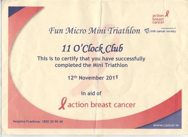 Mini Triathlon CertificateWell done to Third Year students, Kara Stein and Sadbh Charles completed the Fun Micro Mini Triathlon in aid of Action Breast Cancer at the weekend of 12th November. It involved swimming at Forty Foot, running to Teddy's Ice Cream bar and then cycling to Dalkey. According to Sadbh, "the swim was freezing". (Click on thumbnail to open an enlarged version of image.)